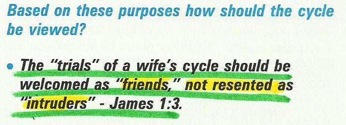 Well…in a sense he is right. We shouldn’t resent hardships in life but grow from them. Not sure how the menstrual cycle automatically qualifies as a “testing of your faith.” But like any physical hardship, I suppose it could be. So, I guess here we have a possible stretch rather than outright twisting. Gothard must be okay after all…