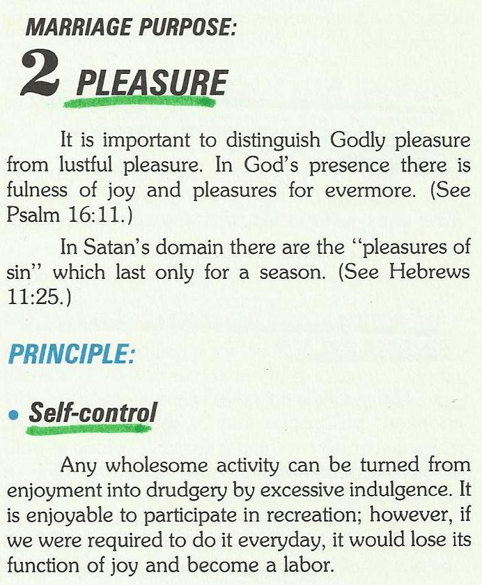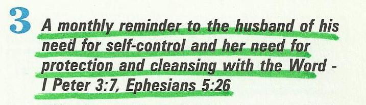 Does a man need to have self-control? Yup. Do either of these verses mention this? Nope. More interestingly, notice Mr. Gothard’s approach to having self-control – don’t have sex for 14 days out of each month. In other words, according to Mr. Gothard, regular and lengthy periods of abstinence help to promote self-control (he hasn’t explained this yet but will later).