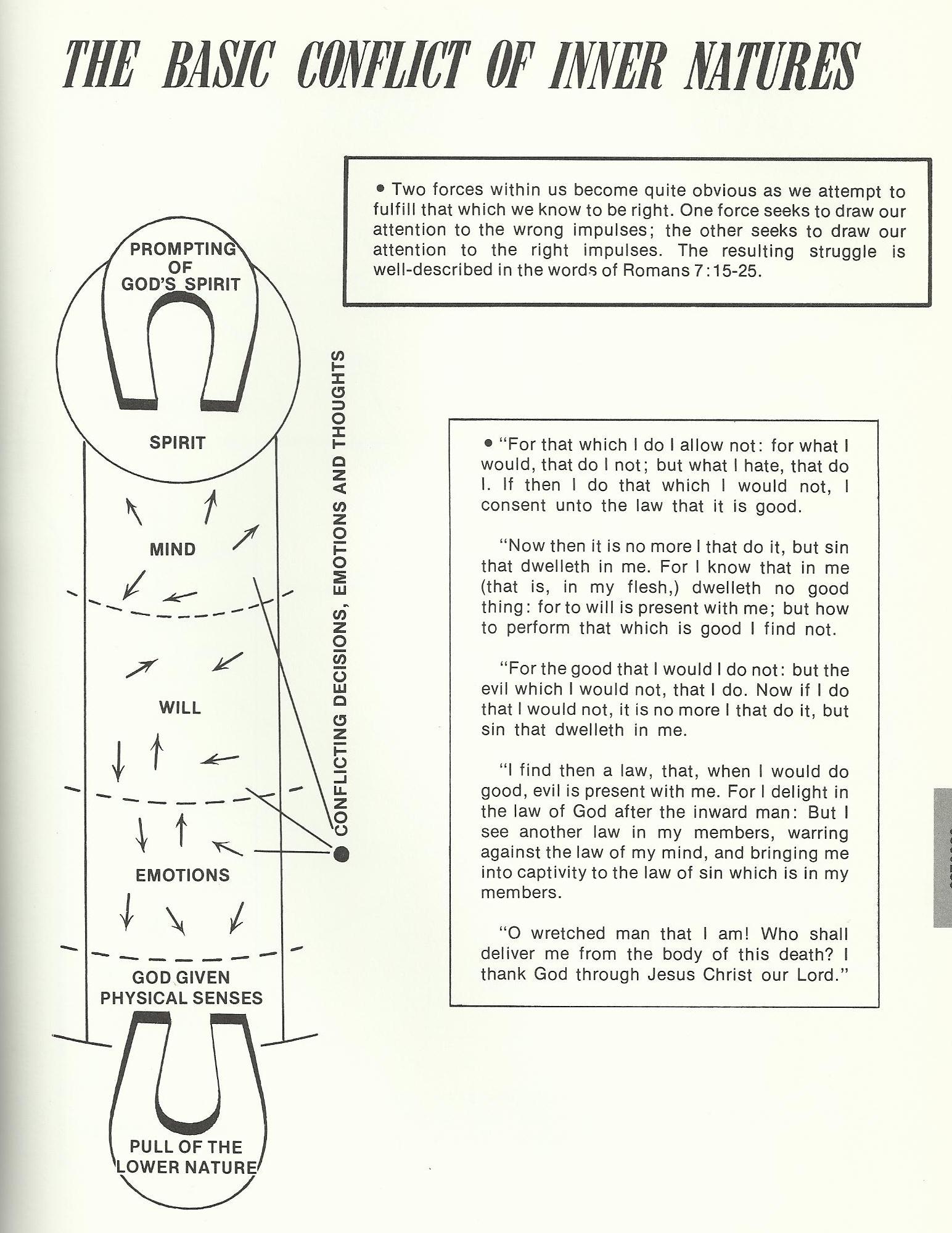 The illustrations above assume that the desires of the spirit are good while the desires of the body are evil. However, 2 Cor 7:1 states that the spirit can sin just as much as the body, ” let us purify ourselves from everything that contaminates body and spirit, perfecting holiness out of reverence for God.” Also, it is equally wrong to say that every physical desire is bad. The first chapter of Genesis states God made our material world “good”. Where then does evil come from? Surprisingly, evil does not come from the physical world, it comes from the spiritual world! Jesus said, “Don’t you see that nothing that enters a person from the outside can defile them… For it is from within, out of a person’s heart, that evil thoughts come—sexual immorality, theft, murder, adultery, greed, malice, deceit, lewdness, envy, slander, arrogance and folly.” (Mark 7:18-22)