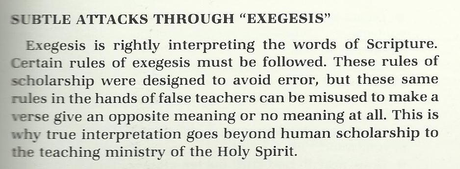 What this nonsense effectively does is give anyone permission to skip over logic, reason, and scholarship. Forget a commentary, try “What is ‘the Spirit’ telling your ‘spirit’?” The problem is that Gothard claims the ultimate authority is your “spirit” in interpreting scripture. But if someone is using bad exegesis, would it not be better to counter it with good exegesis? After all, how in the world are we to combat what the “Spirit” is telling someone else? There isn’t. Which is exactly what Gothard wants – so he can make the scripture say anything he chooses (While claiming the high ground of “the Spirit’s” interpretation).